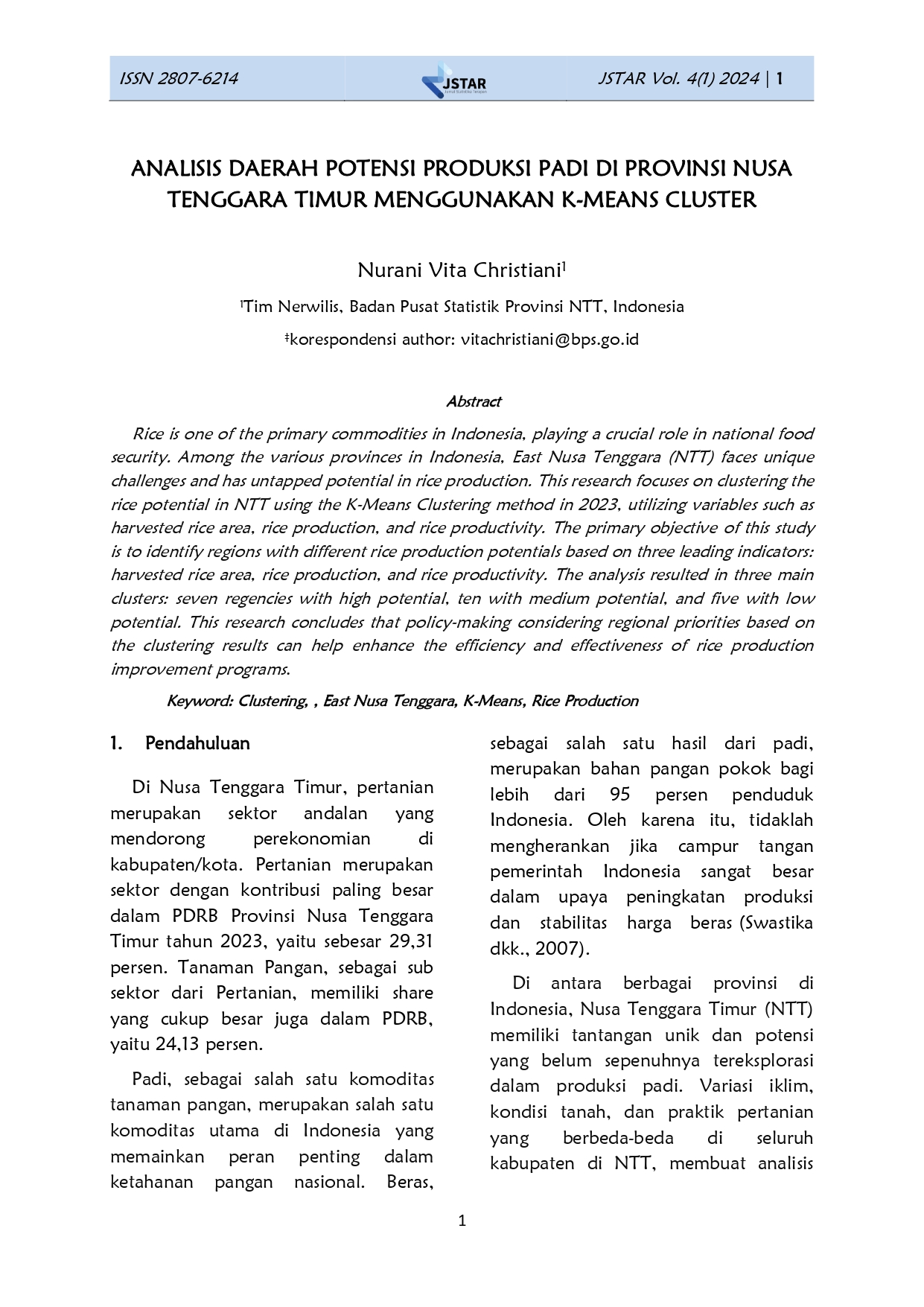 ANALISIS DAERAH POTENSI PRODUKSI PADI DI NTT MENGGUNAKAN K-MEANS CLUSTER